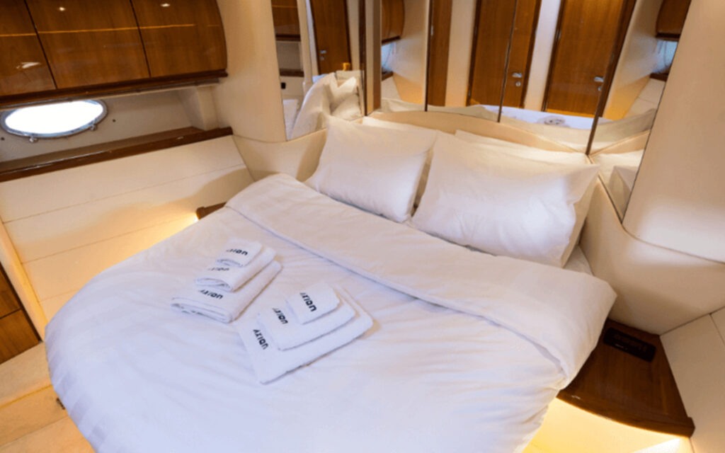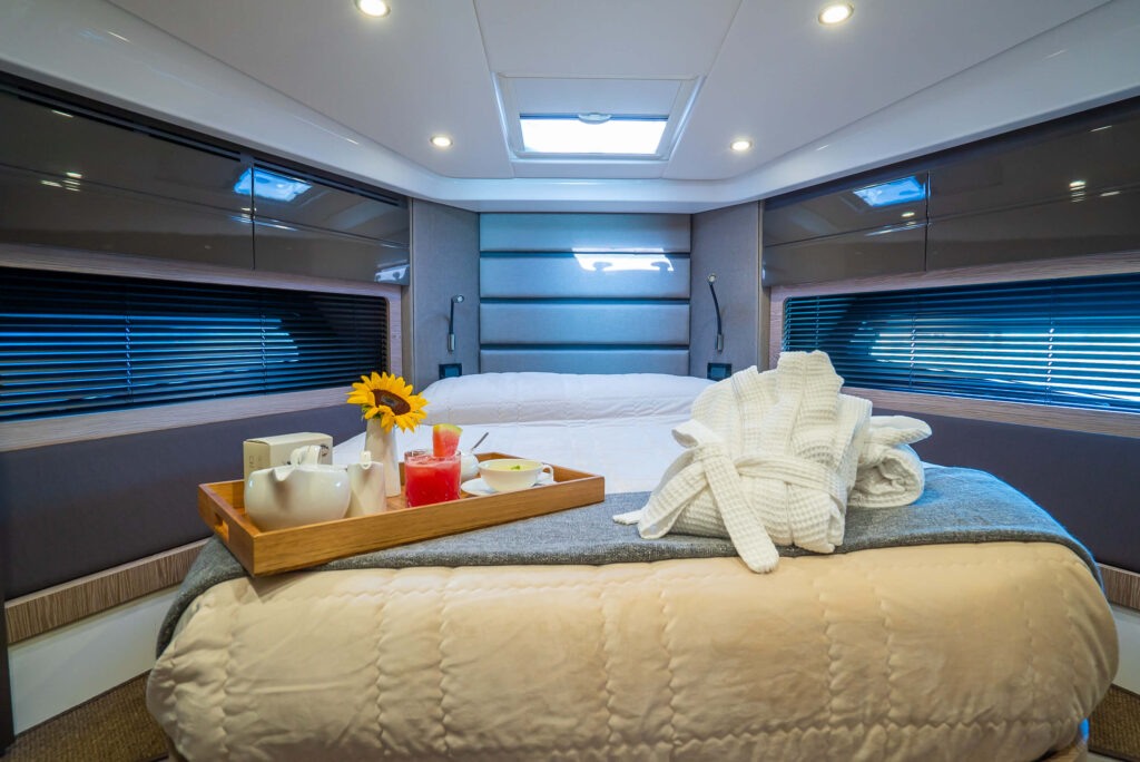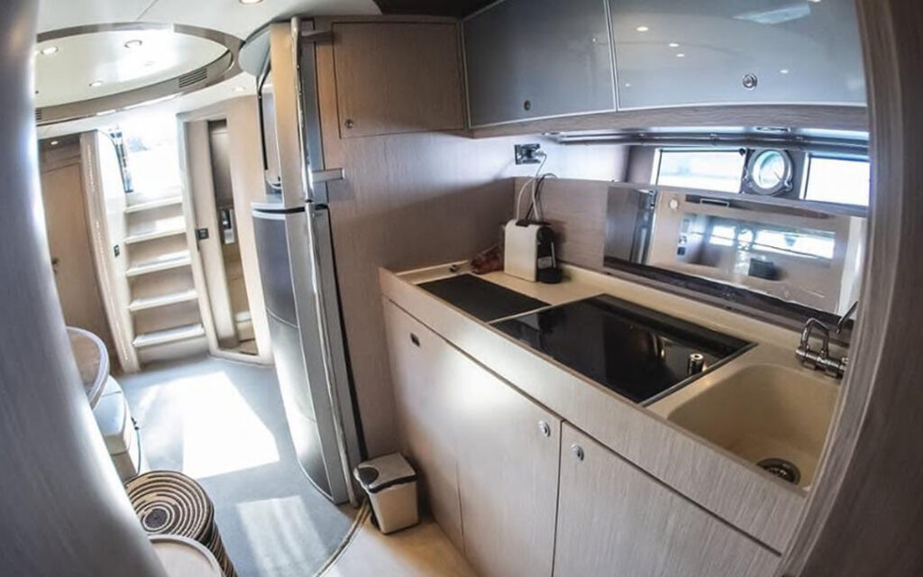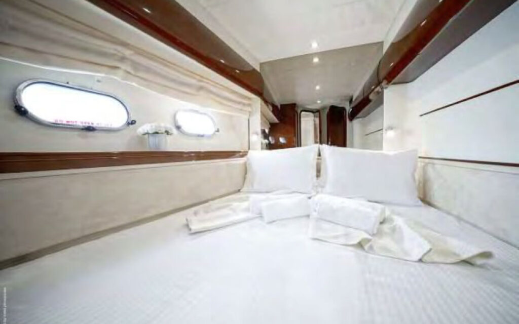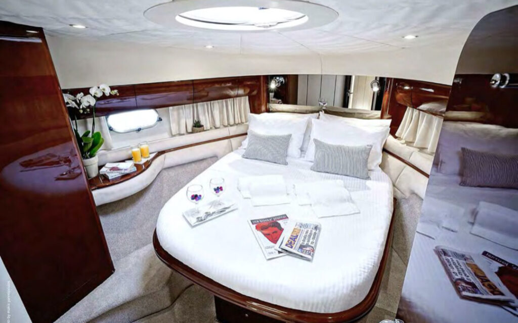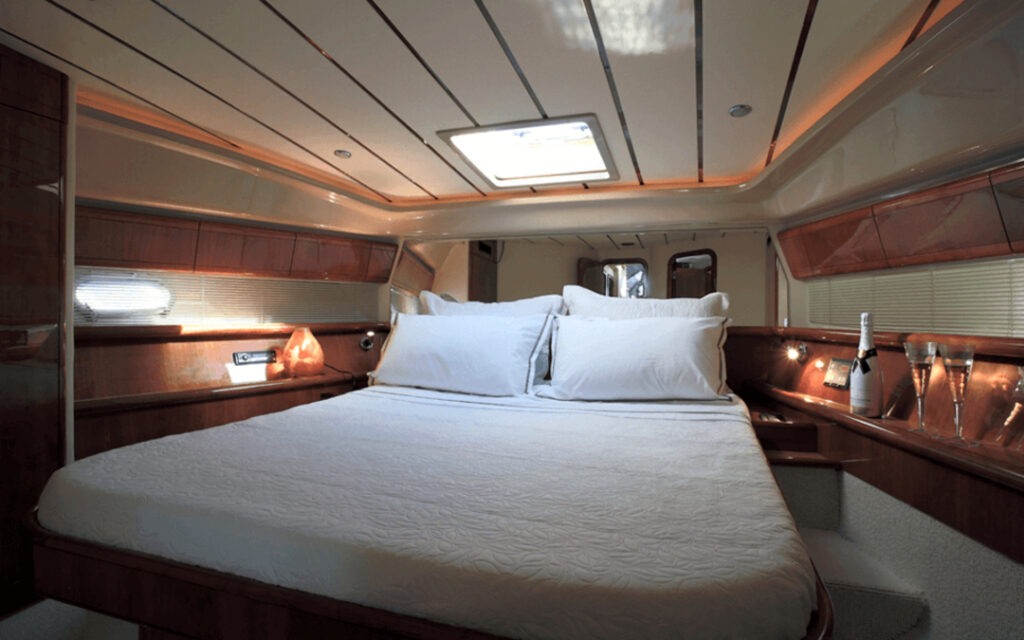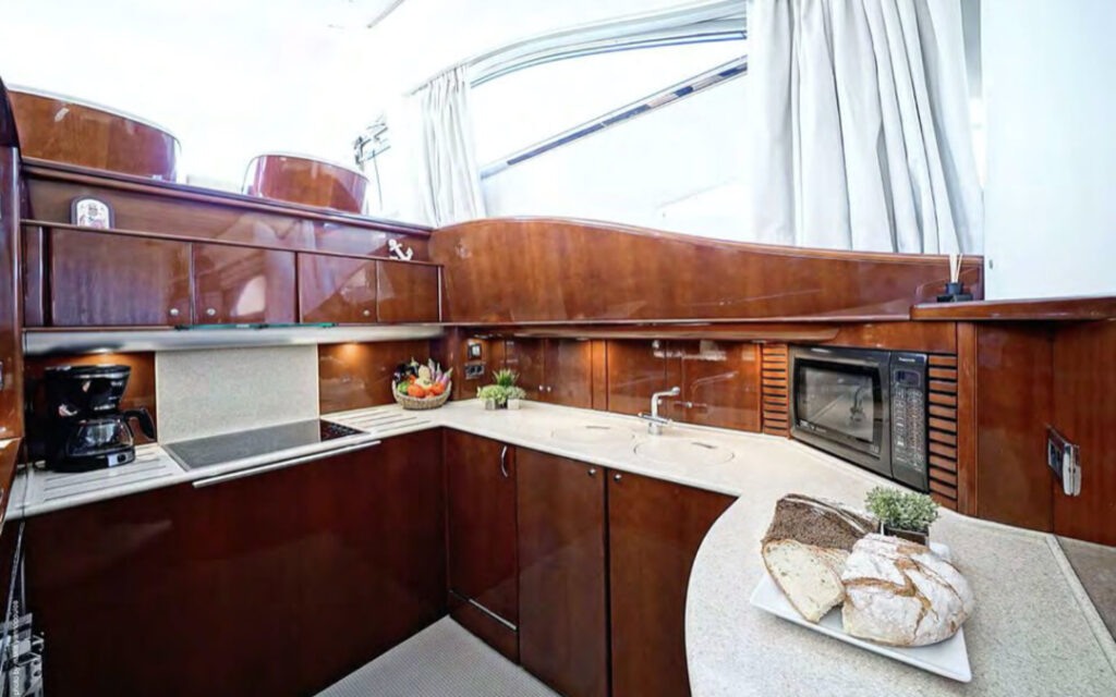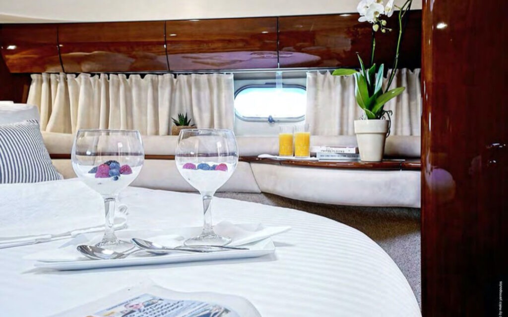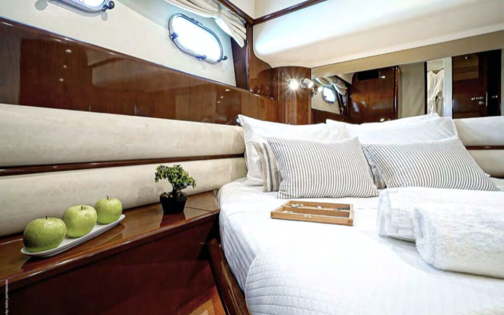 This 53′ sunseeker is galley equipped with: Espresso coffee machine, microwave, refrigerator, toaster. Wet bar and dining area in the cockpit which is perfect for entertaining. Outside back deck is ideal for relaxing soaking up the sun and taking in the breathtaking views. Enjoy the best yachts in Mykonos and exclusive services!