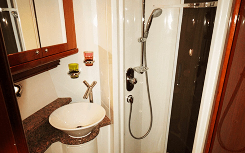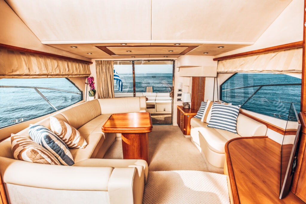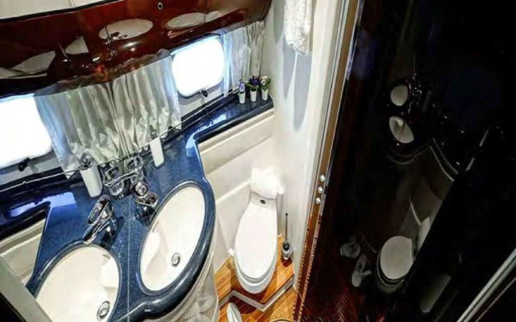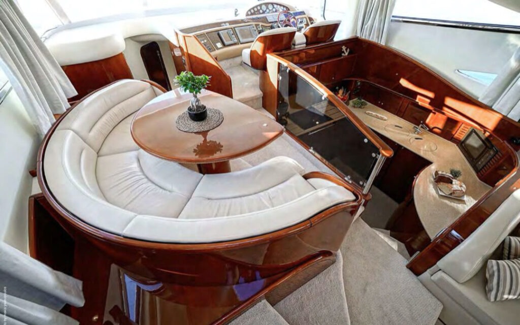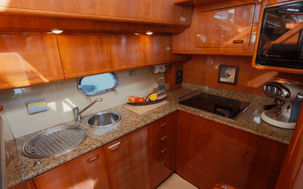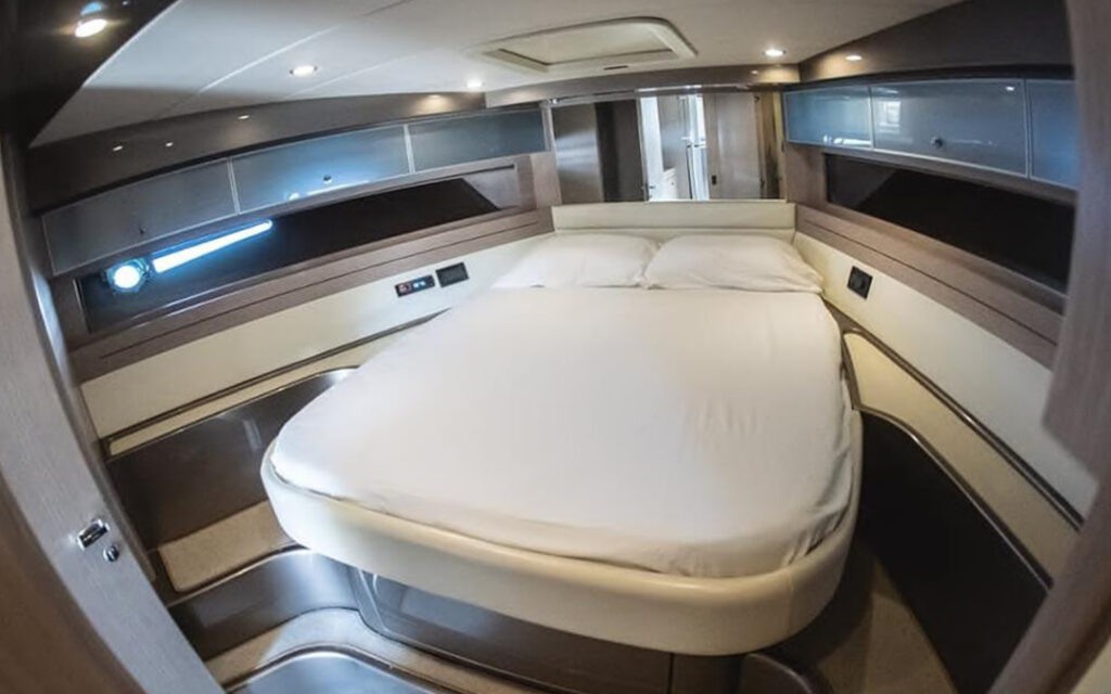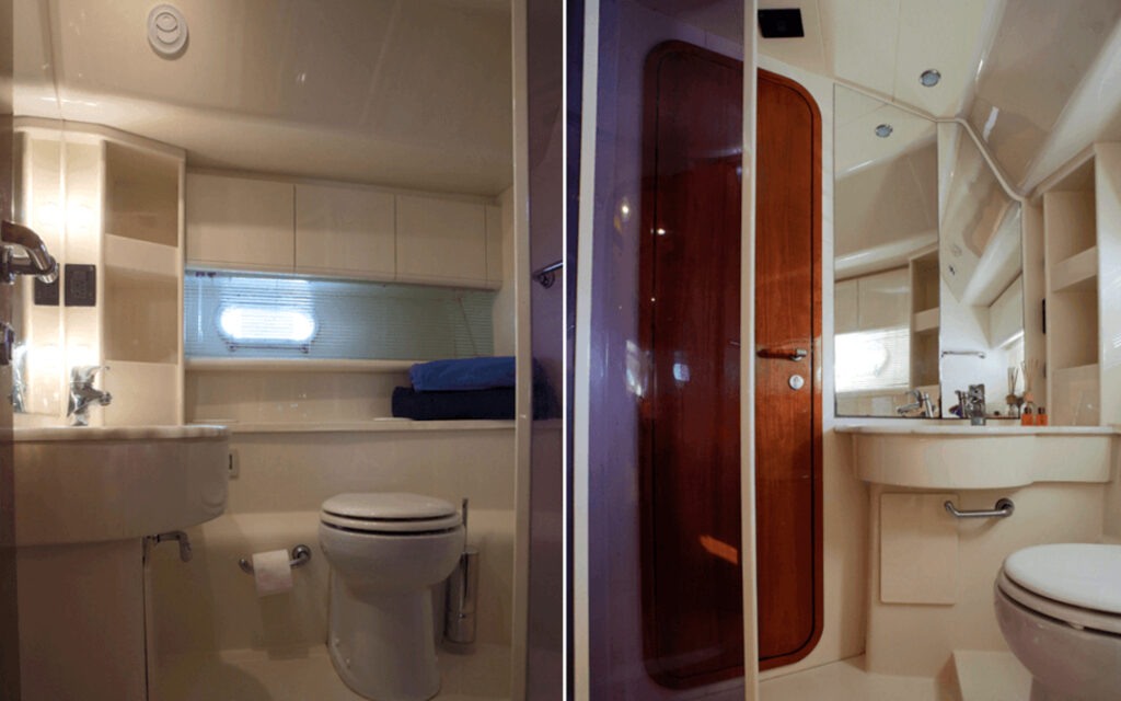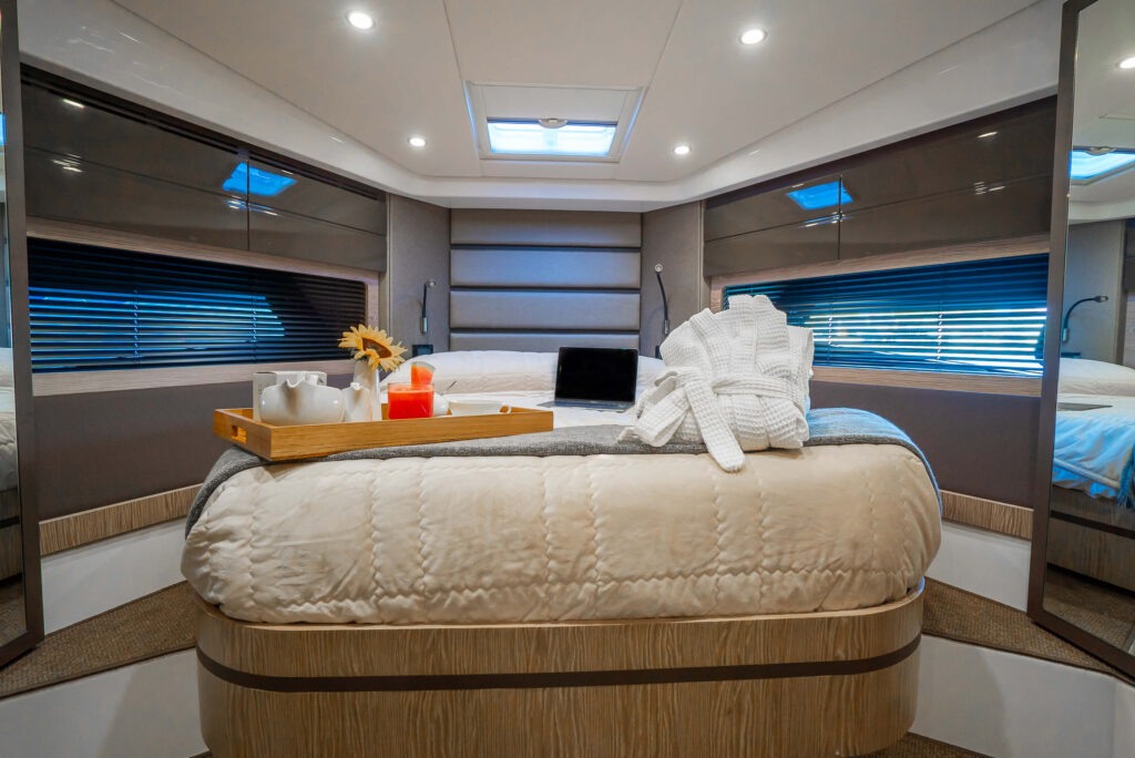 This 53′ sunseeker is galley equipped with: Espresso coffee machine, microwave, refrigerator, toaster. Wet bar and dining area in the cockpit which is perfect for entertaining. Outside back deck is ideal for relaxing soaking up the sun and taking in the breathtaking views. Enjoy the best yachts in Mykonos and exclusive services!
