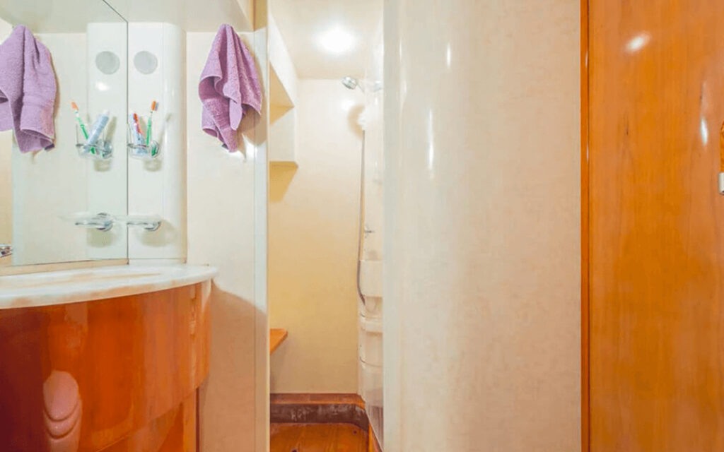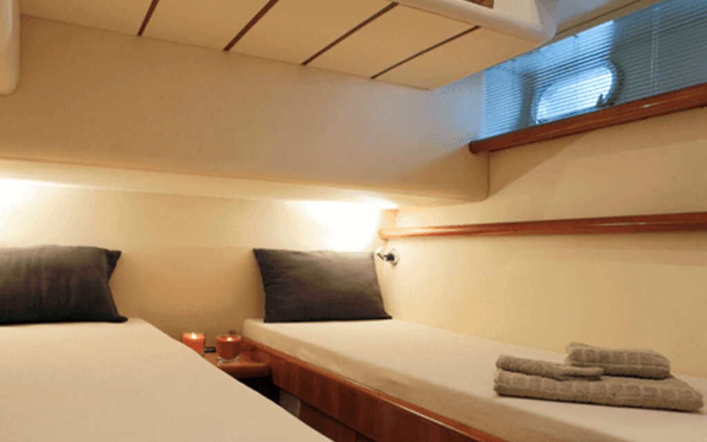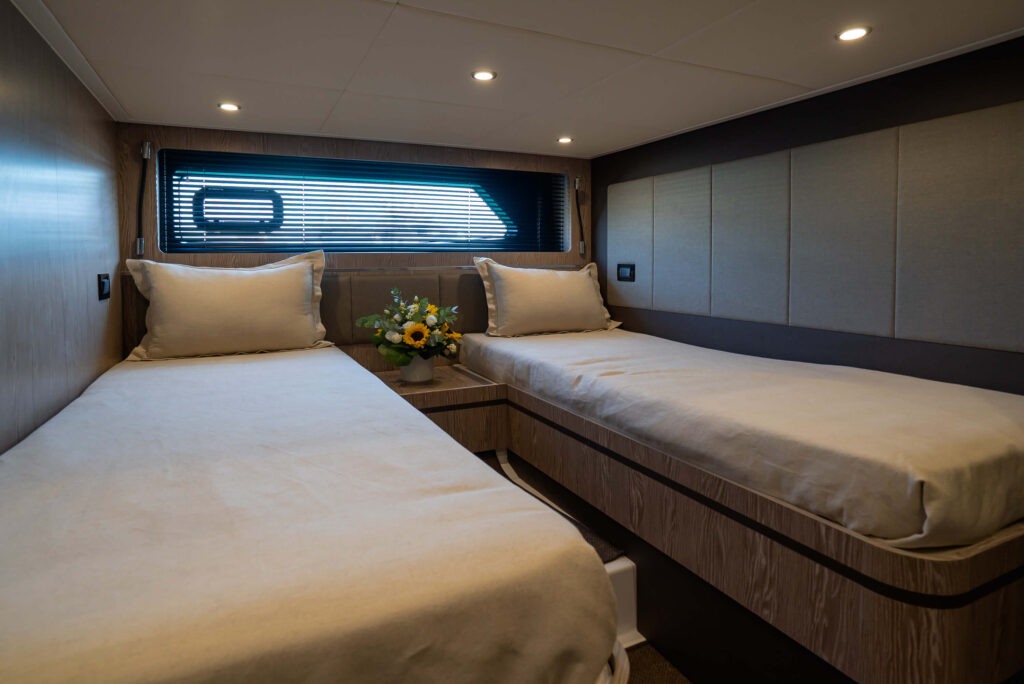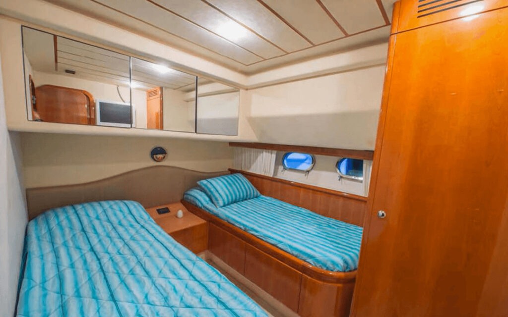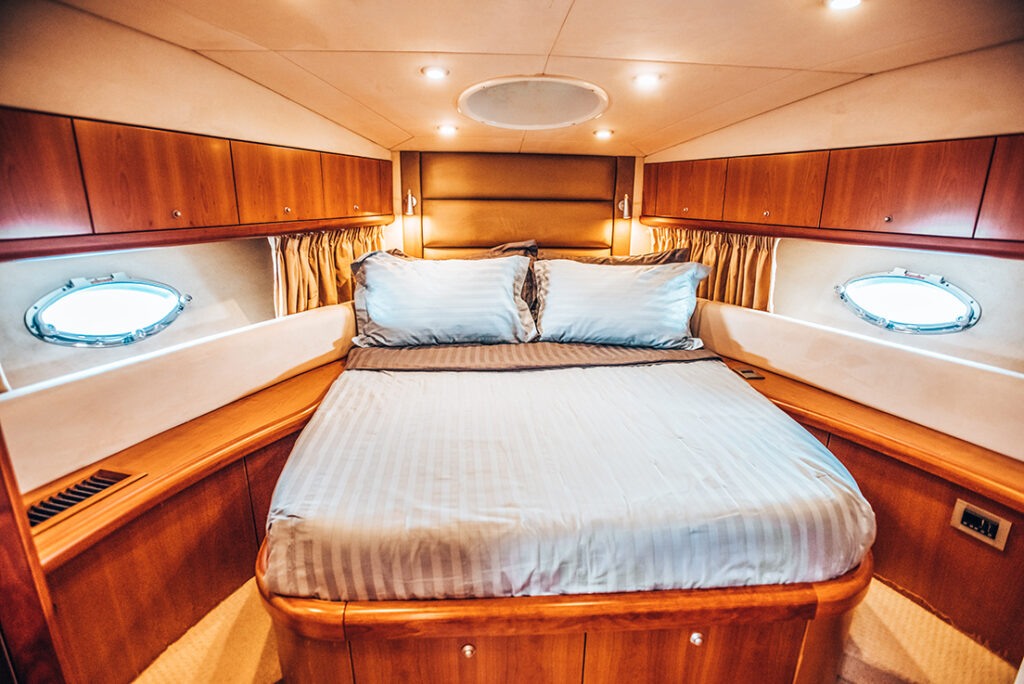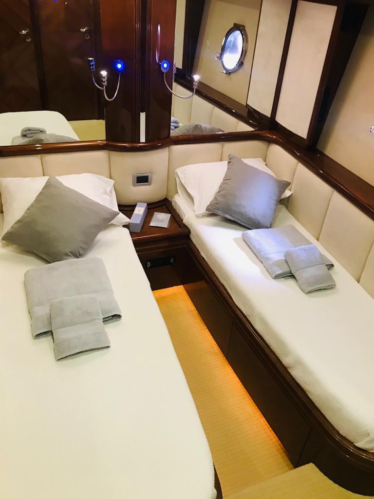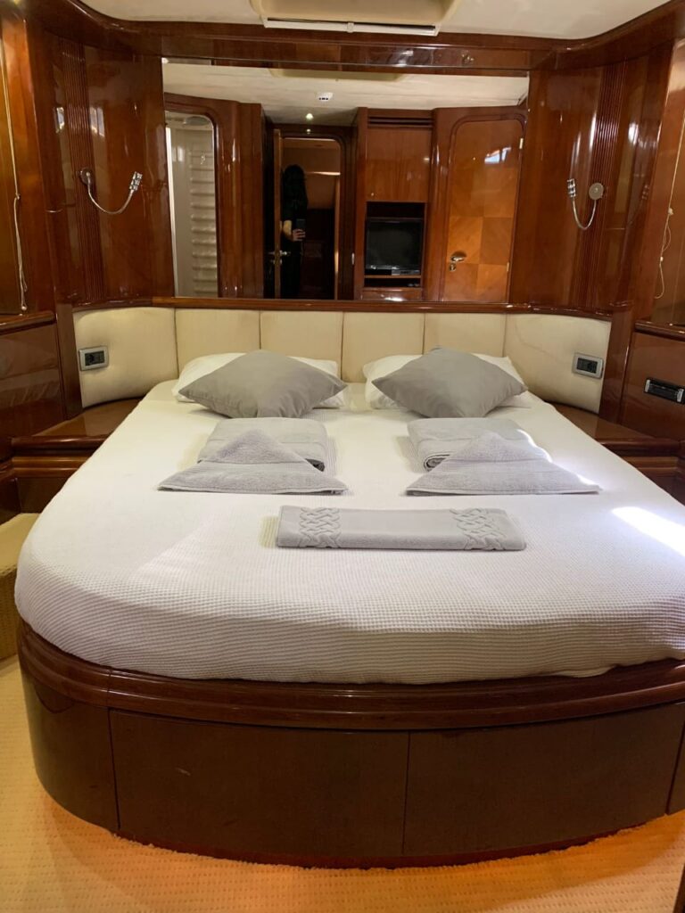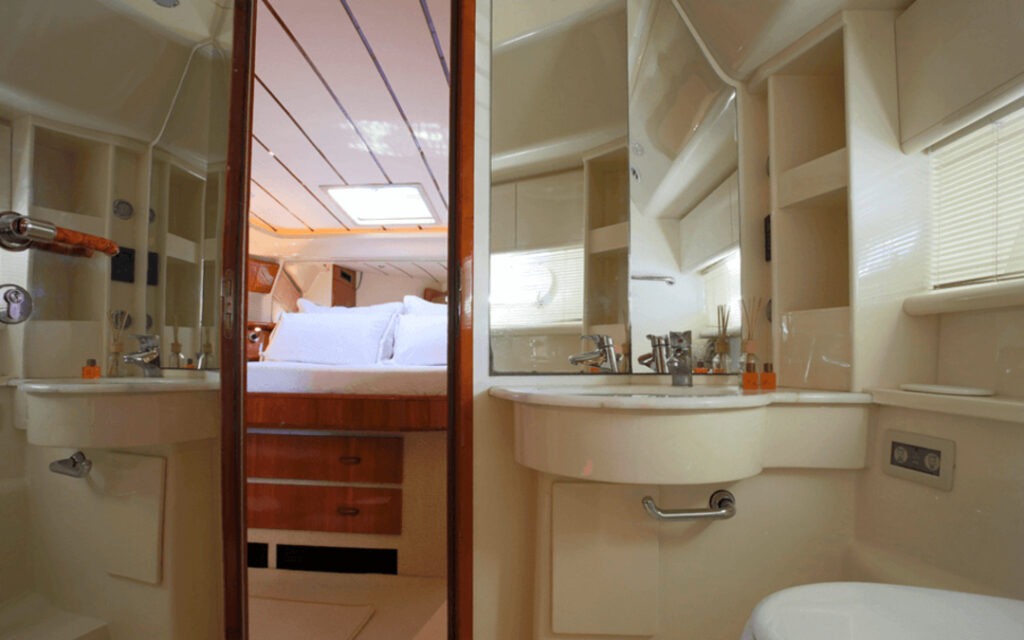Below deck there are two luxurious ensuite cabins including a forward VIP suite, a full beam master suite with 3 beds.