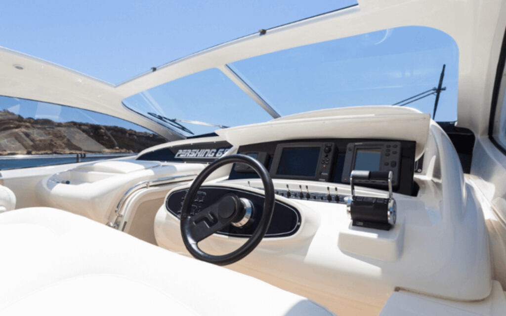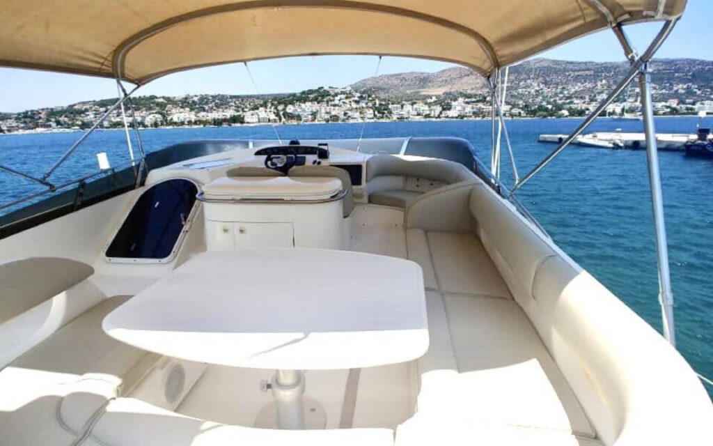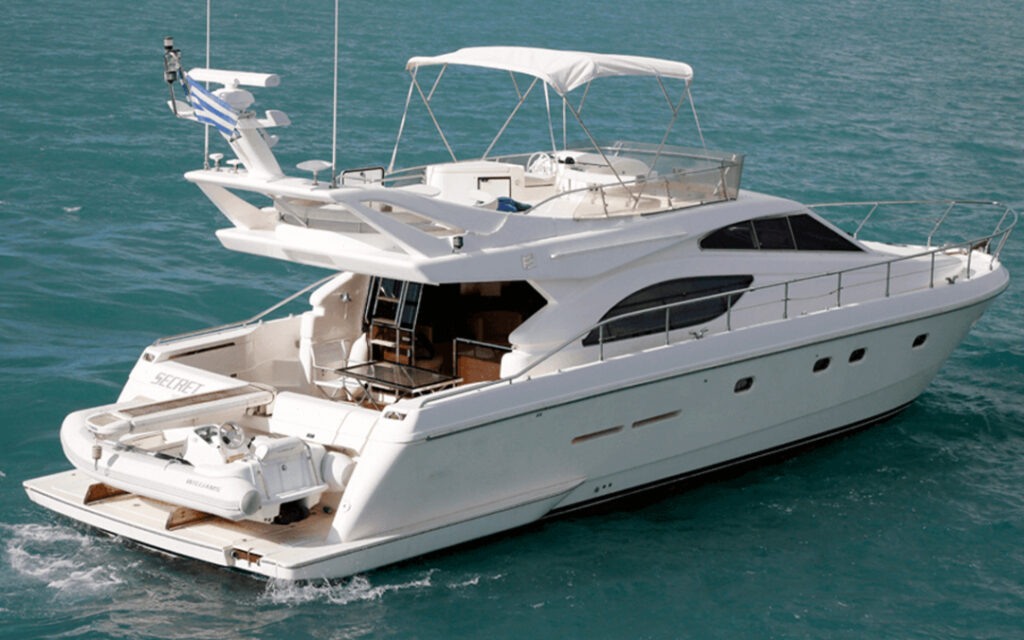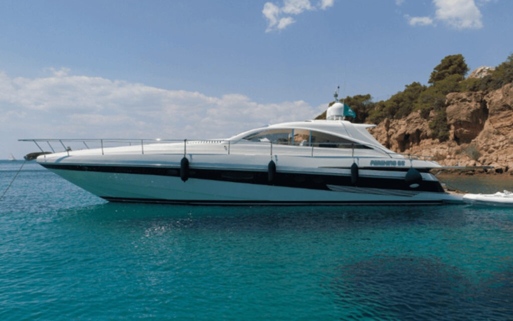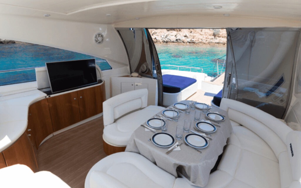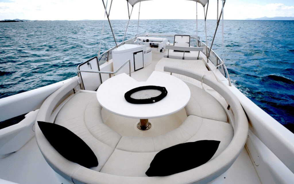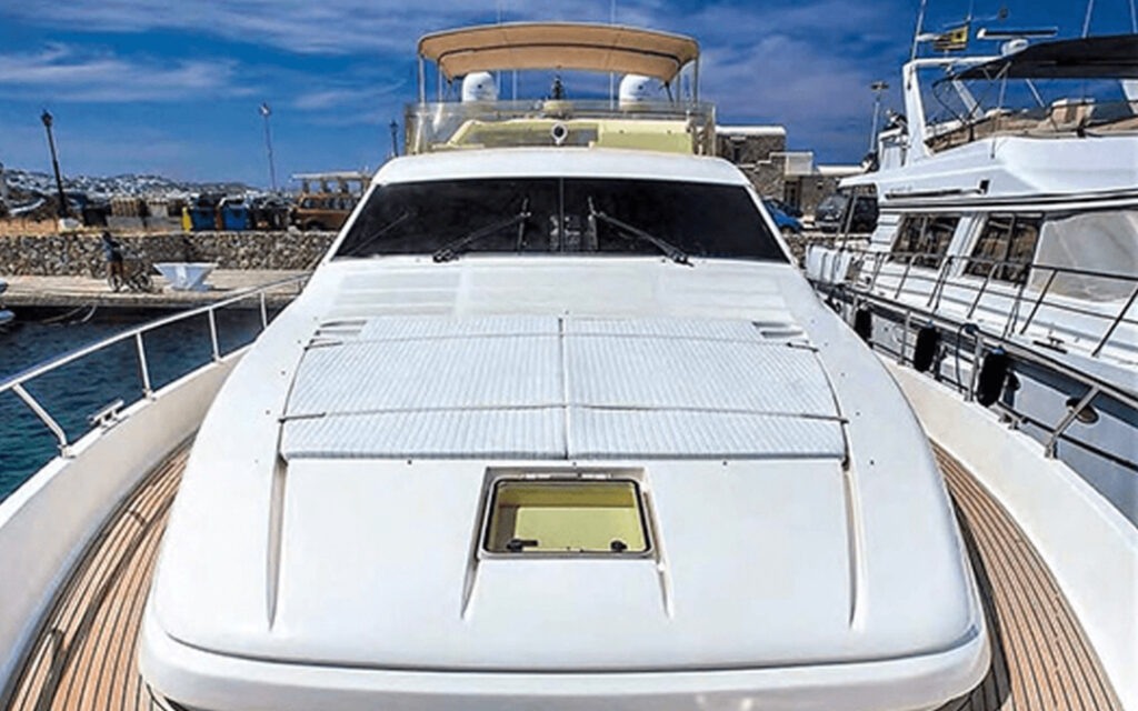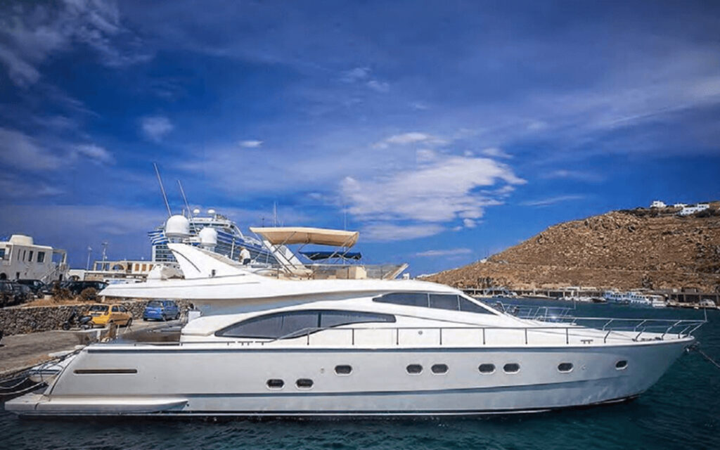 A classy model when introduced by Ferretti, the 53 features an open cabin design that makes this Yacht feel larger than 53 ft. She provides sleeping accommodation for PAX 6, a comfortable convertible dinette and mid cabin, a nicely fitted cockpit with a fore and aft facing rear cockpit seats, a wet bar, a transom gate leading to a large swimming platform along with a spacious fly bridge. Book the finest yachts in Mykonos.