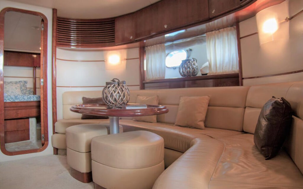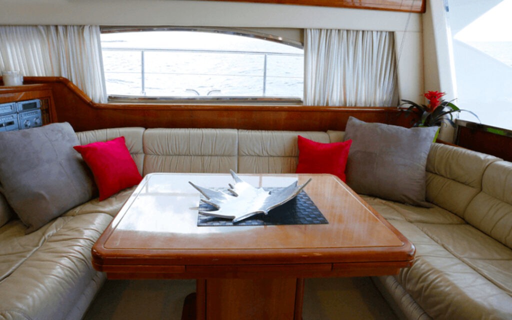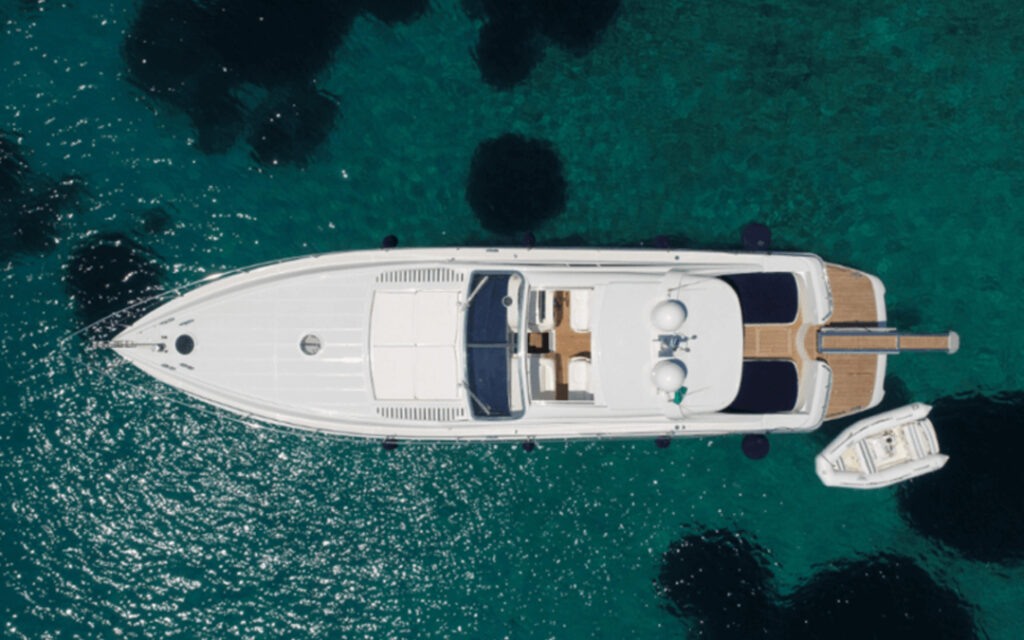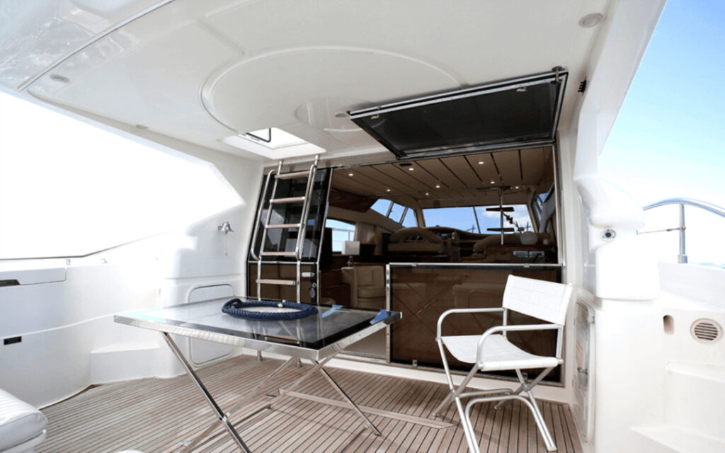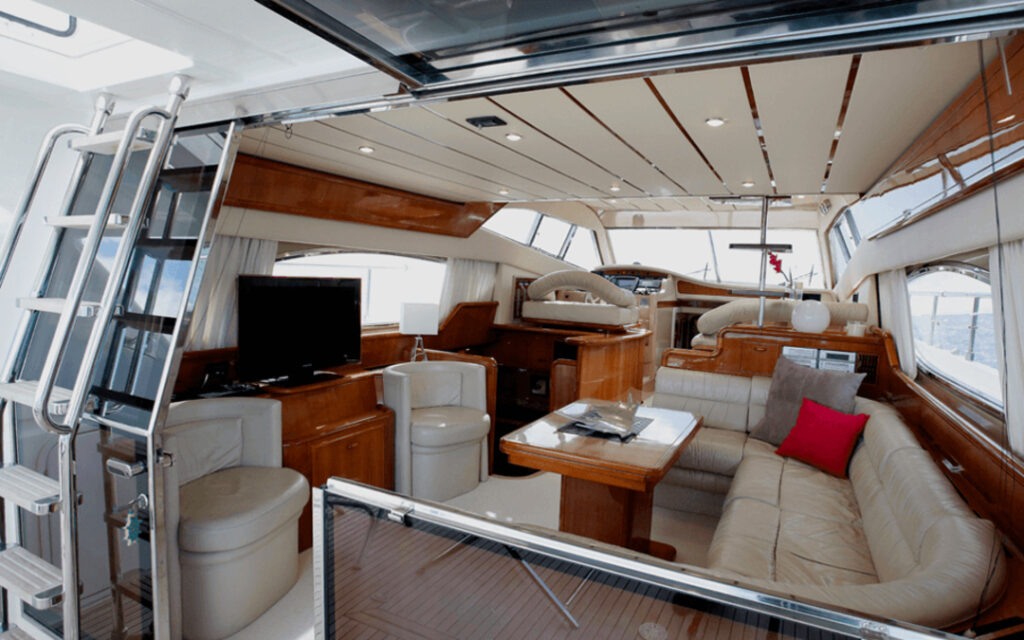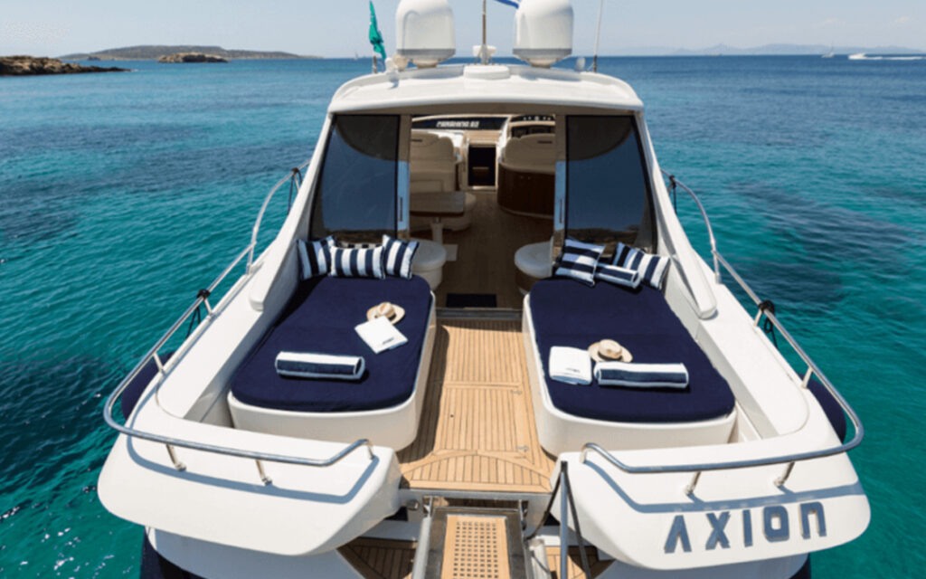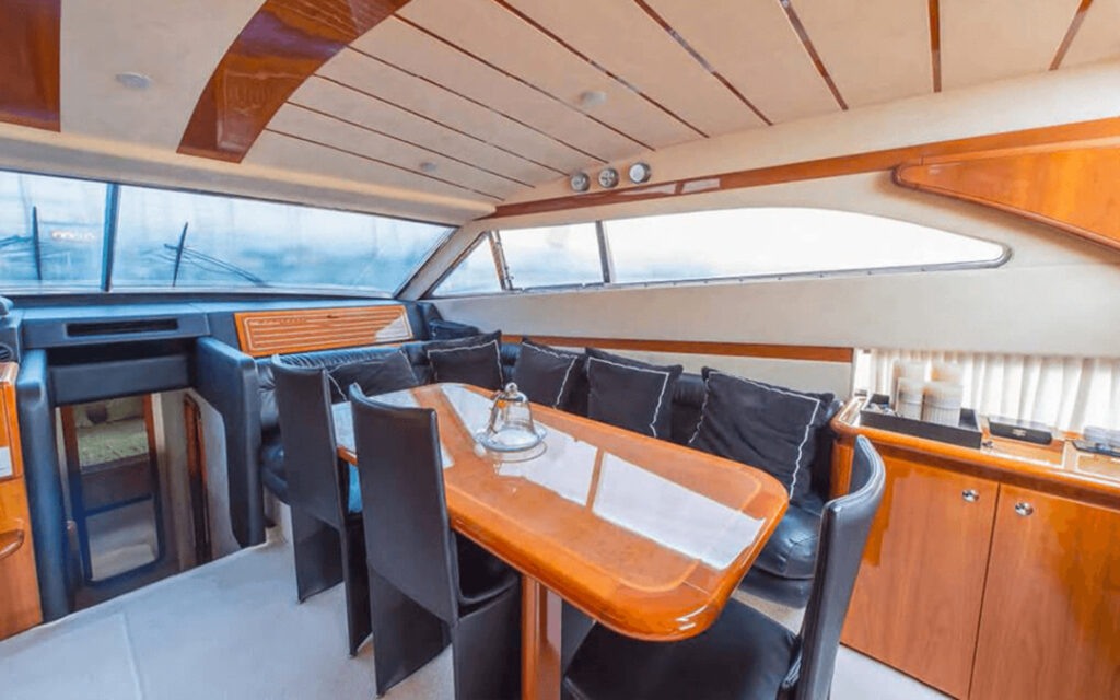 A classy model when introduced by Ferretti, the 53 features an open cabin design that makes this Yacht feel larger than 53 ft. She provides sleeping accommodation for PAX 6, a comfortable convertible dinette and mid cabin, a nicely fitted cockpit with a fore and aft facing rear cockpit seats, a wet bar, a transom gate leading to a large swimming platform along with a spacious fly bridge. Book the finest yachts in Mykonos.