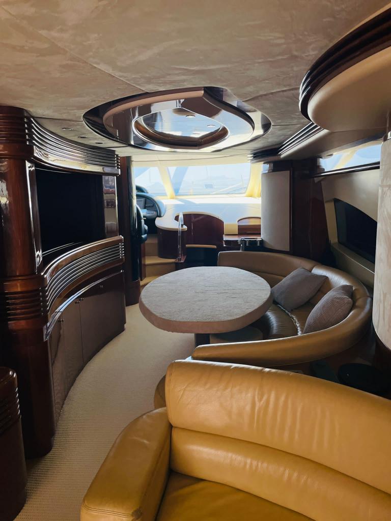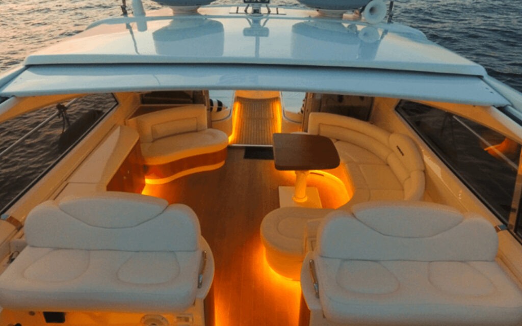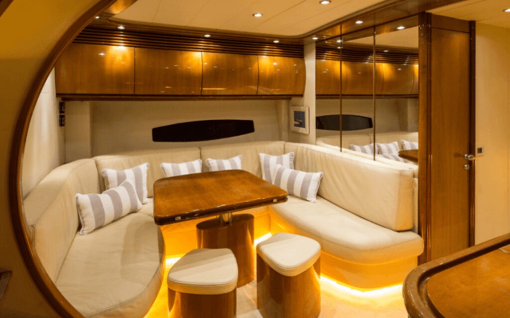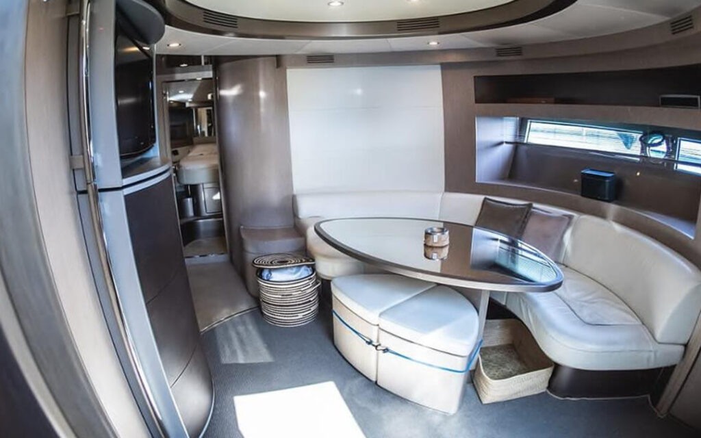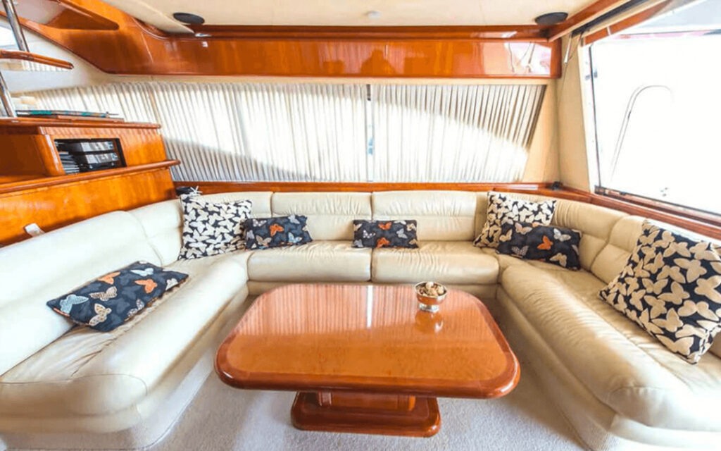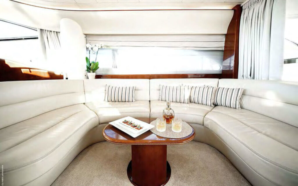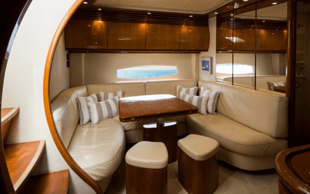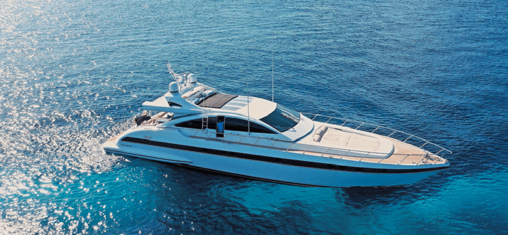A classy model when introduced by Ferretti, the 53 features an open cabin design that makes this Yacht feel larger than 53 ft. She provides sleeping accommodation for PAX 6, a comfortable convertible dinette and mid cabin, a nicely fitted cockpit with a fore and aft facing rear cockpit seats, a wet bar, a transom gate leading to a large swimming platform along with a spacious fly bridge. Book the finest yachts in Mykonos.