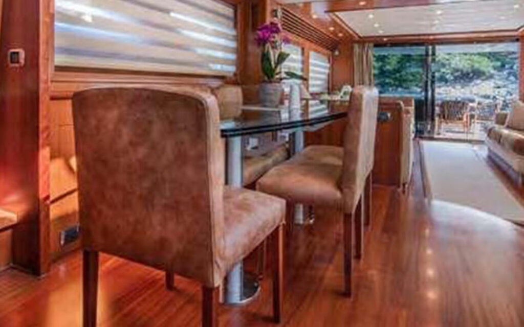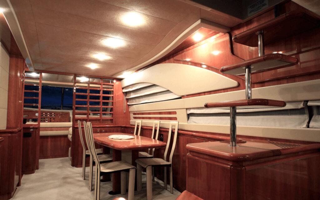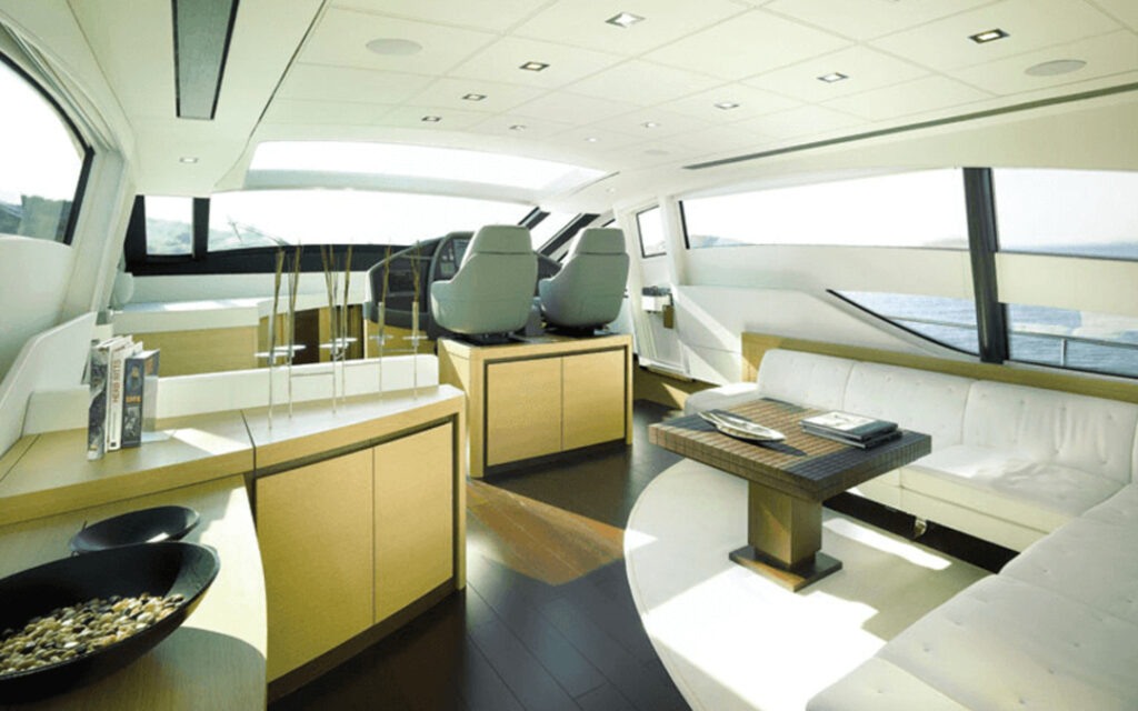 The cockpit, measuring almost 60 square metres, is divided into 4 zones that include a second dinette decorated with the same fabric as the