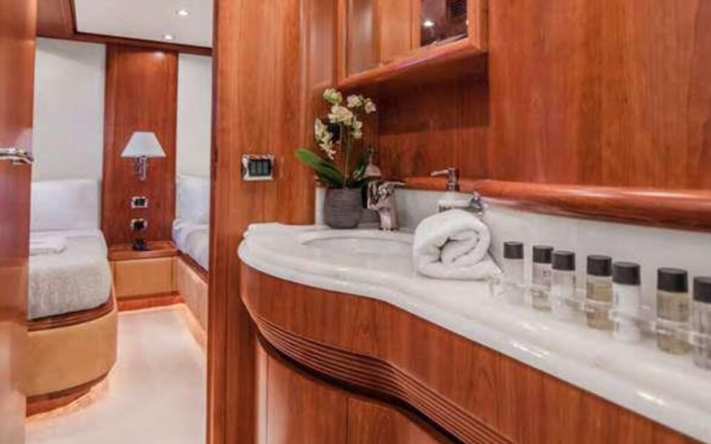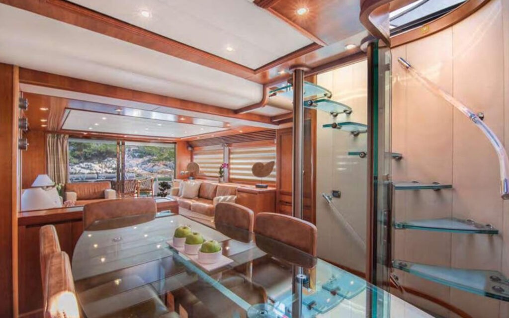 This glamorous vessel features an interior décor boasting warm woods, fine marbles and quality furnishings throughout. The salon and dining are an open plan. Panoramic windows fill the space with natural light creating an airy ambiance. Exterior living aboard is generous, ideal for relaxing and entertaining. A full beam extended swim platform provides effortless water access.