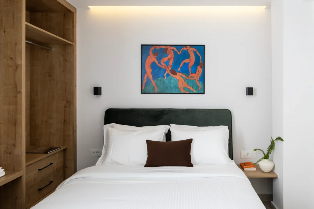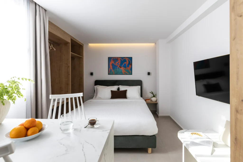 - Spacious and Stylish: Suite Xenios features a modern layout with spacious interiors, including a luxurious bedroom, a chic living room, and a well-equipped kitchenette.