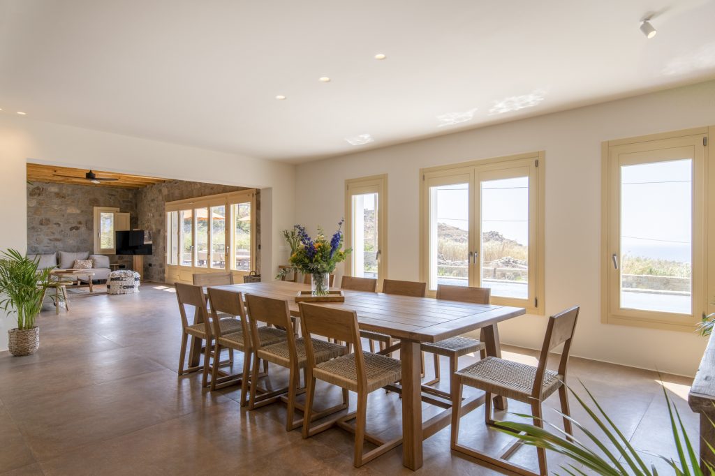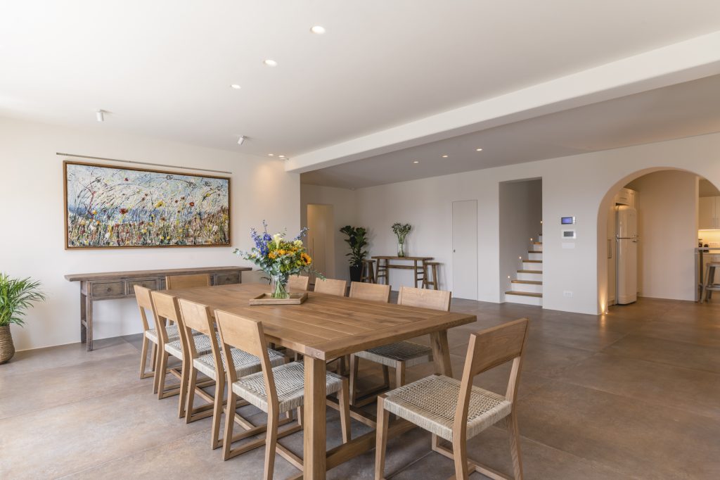 Open plan fully equipped kitchen with Smeg appliances, spacious living room with TV, ceiling fans, an amazing pool and sea view, an indoor dining area [8 seats] -direct access to the pool and outdoor dining area, guest bathroom with shower