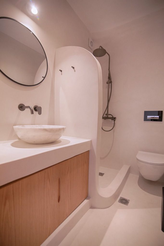 The main exterior space hosts an elegant infinity pool of 25 square meters, surrounded by a sun deck, relaxing sun beds, large cushions and a shaded area under the pergola. In addition, this boutique luxury villa Mykonos is an intimate nest for families or traveling couples and groups of friends. The ideal hideaway to enjoy memorable holiday time.