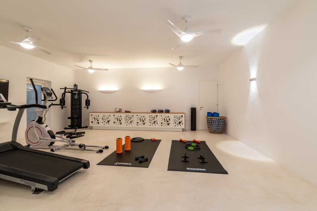 - The lower ground floor consists of a fully equipped kitchen and dining/ office area for 6 guests, a spacious fully equipped gym, a massage room, a spacious Hammam and a bathroom. At the same level there 3 double bedrooms with king sized beds, en suite bathrooms, amazing sea views and access to the lower level pool and a staff room with a king size bed, en suite bathroom and skylight.