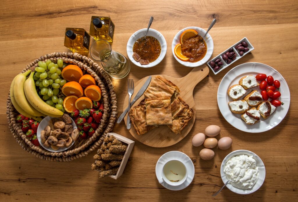 (Mediterranean breakfast includes: coffee, tea, Greek herbal teas, seasonal fruits, dried figs, milk, 2 sort of homemade marmalade, Greek yogurt and honey, cereal (oatmeal and cornflakes), eggs from free range chicken (boiled or scrambled), olives and 2 sorts of bread (plain white or wholegrain).)