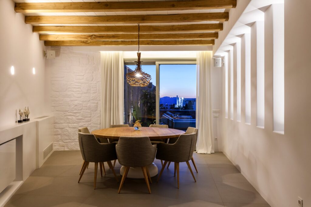 As you approach this imposing property the main door will impress you. As you walk in you may find yourselves in the living area that combines functionality and uncompromised style. Throughout this truly Mykonos Millionaires Villa, you will find only luxury and modern furnishings. The homey central living spaces combine the practicality of dining room, living room and lounge, into extended open plan areas and uninterrupted views towards the garden, heated pool and the sea.