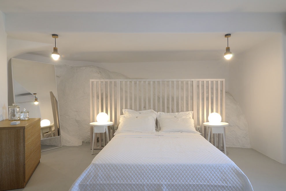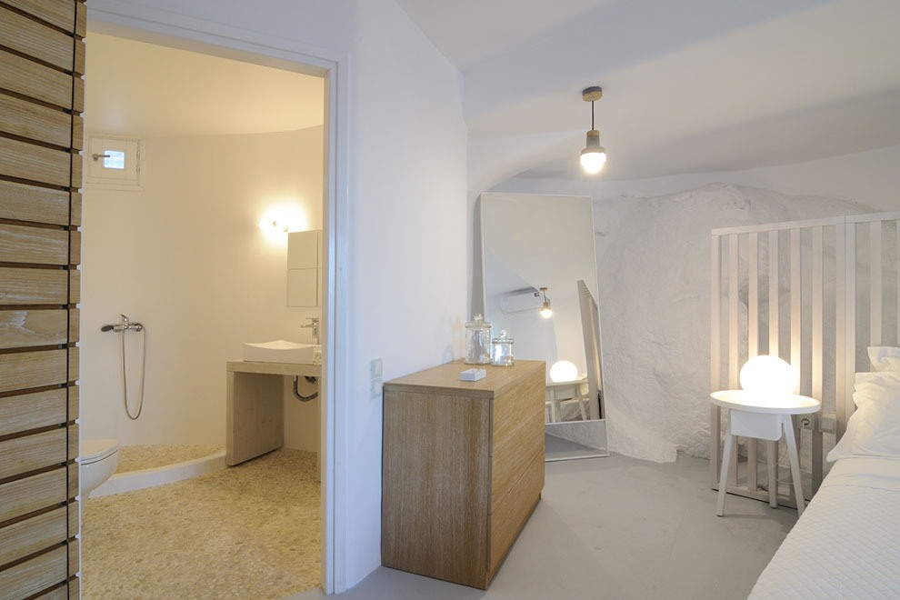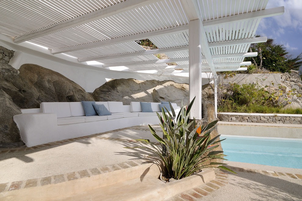 The glamorous villa in Mykonos features 4 bedrooms in total, 3 in the first floor and one of them in the ground floor with its own entrance by the pool.