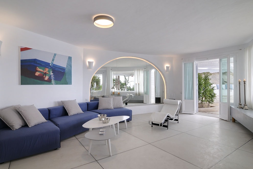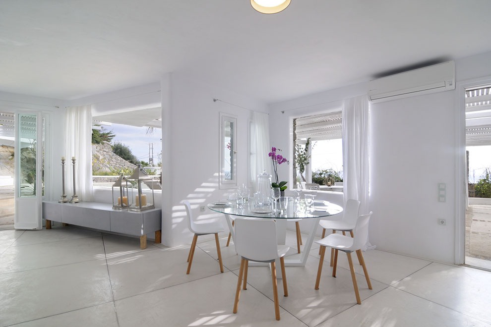 The spacious 4-bedroom fancy villa in Mykonos is situated in the south of the Island, in the area of Aleomandra, 80 meters from the sea front with magnificent views, overlooking the Aegean in the direction of Naxos island, well protected by the strong northern winds.