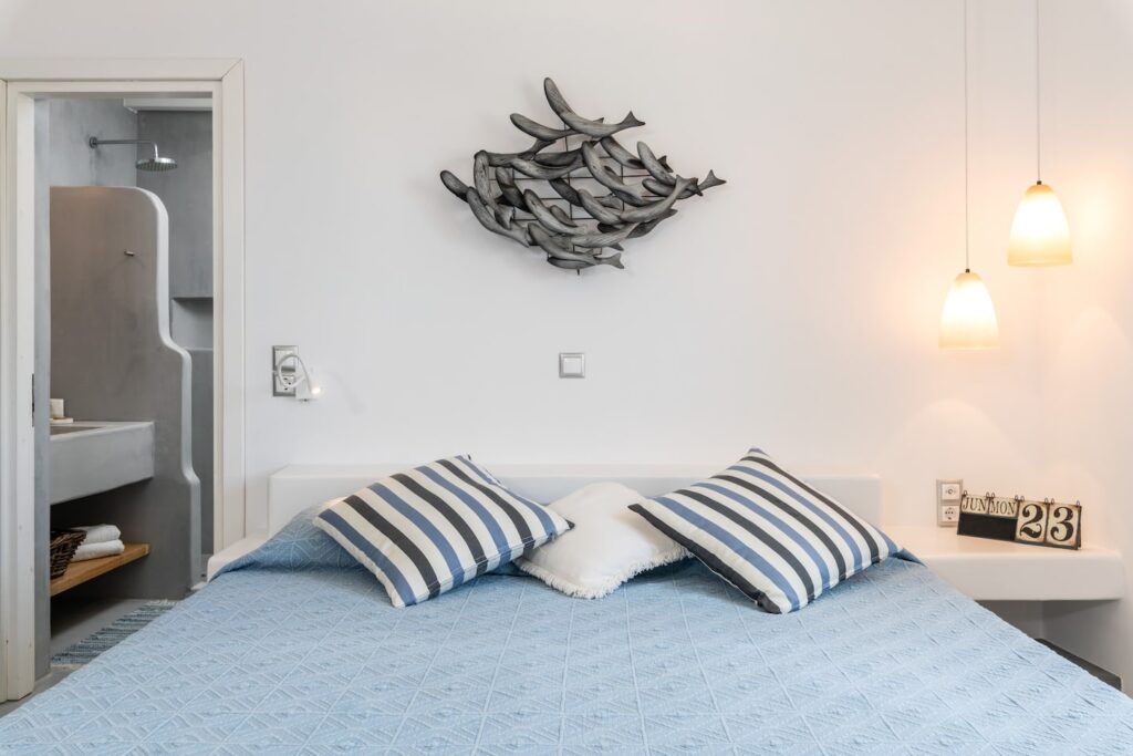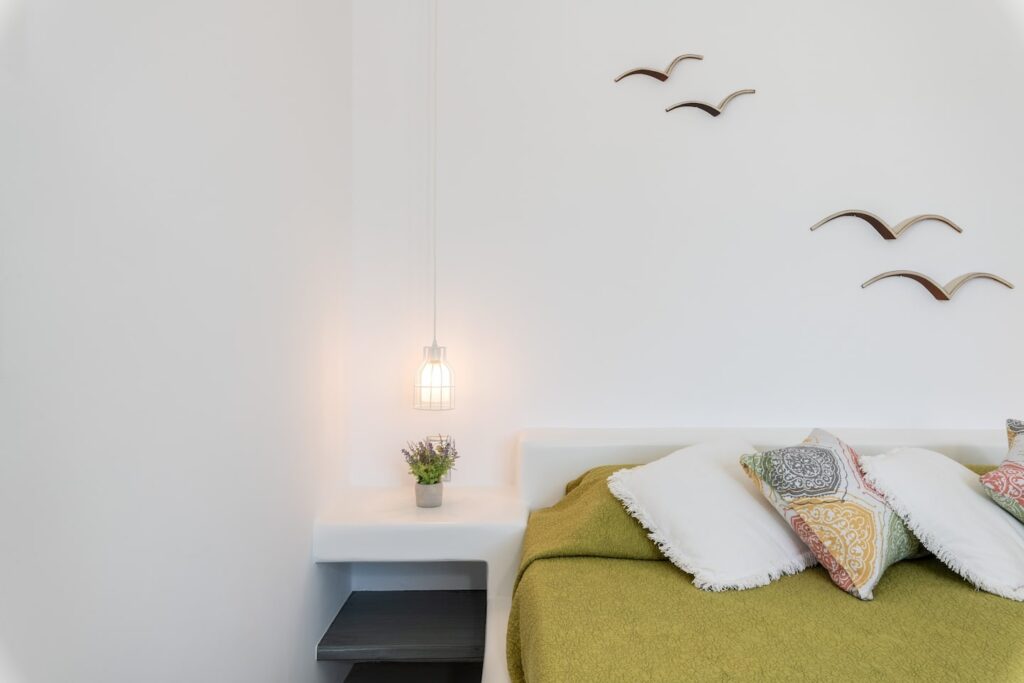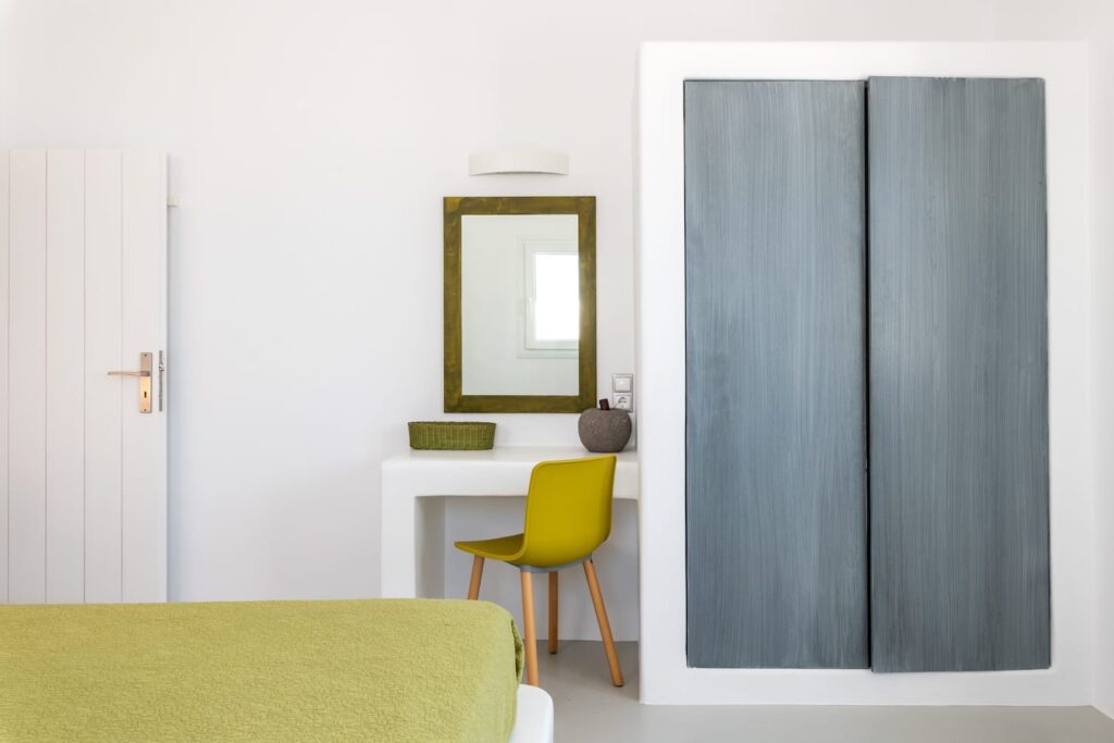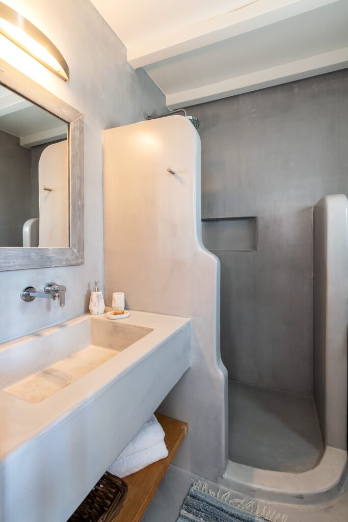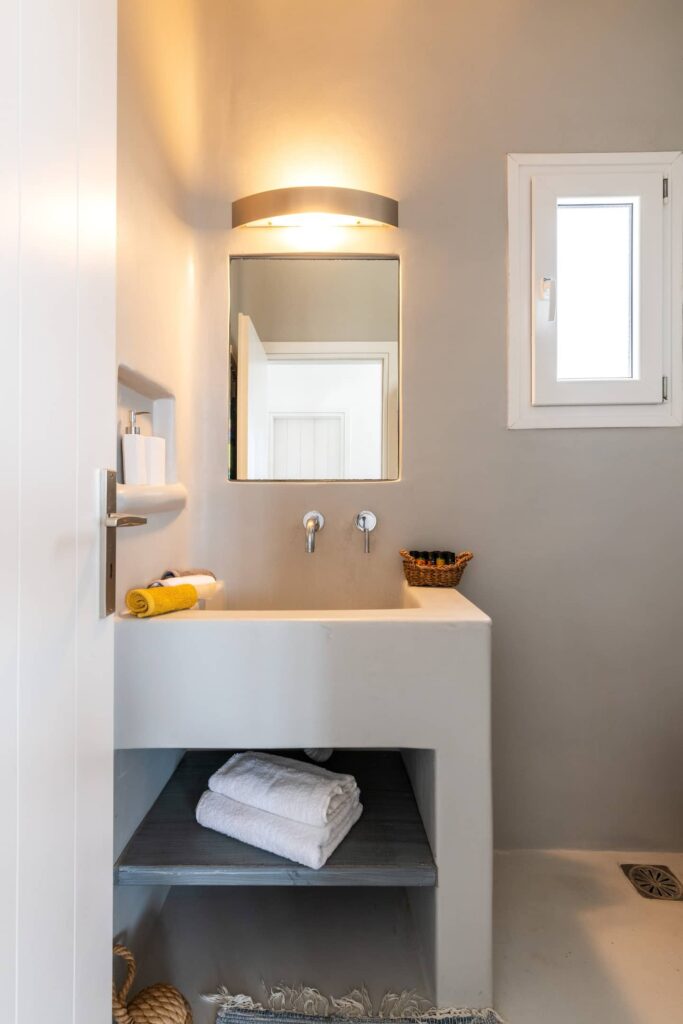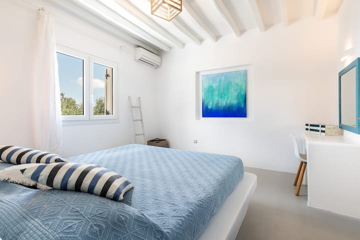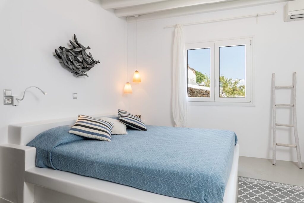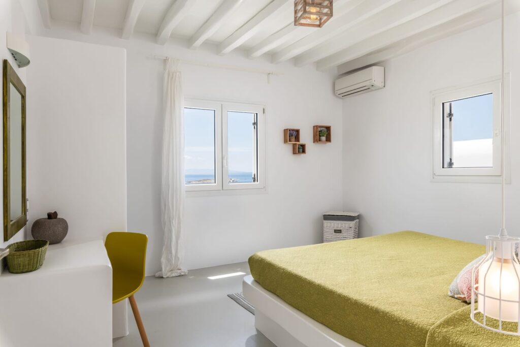 Two spacious, bright bedrooms decorated with minimalist style include built in queen size beds, A/C and free Wi-Fi. Each window brings with it a beautiful view of Mykonian gardens or the Aegean sea.