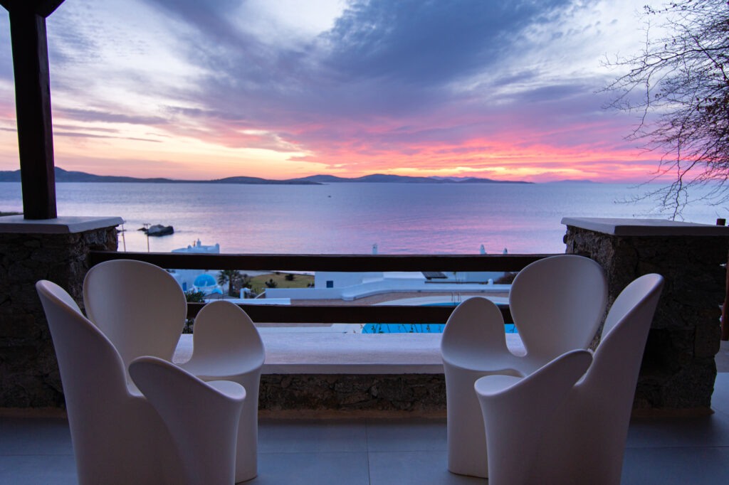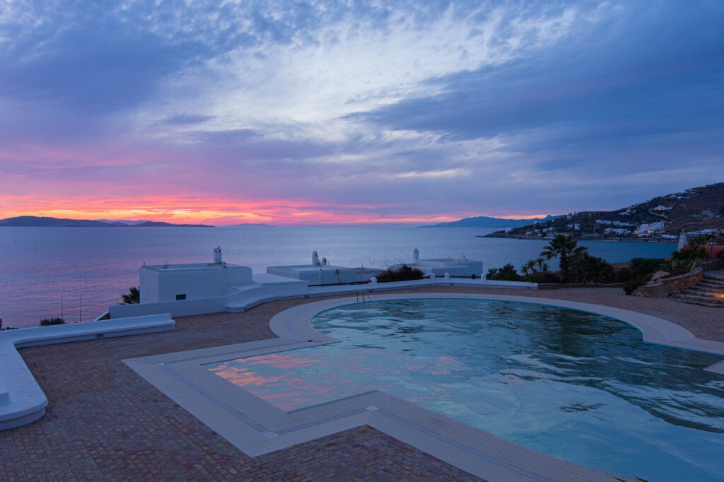 The property has great views of the sea and the famous Mykonian sunset.